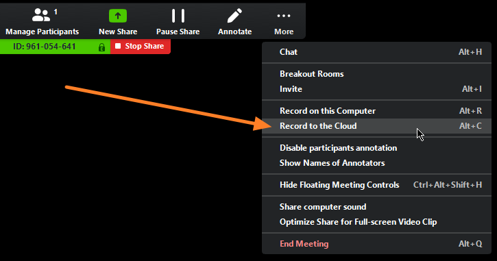 - In the Control Bar, hover your mouse over 'More', and click 'Record to the Cloud', to begin recording.