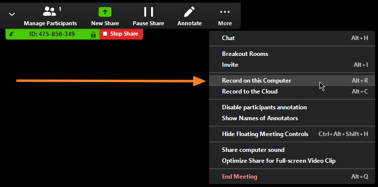 - In the Control Bar, hover your mouse over 'More', and click 'Record on this Computer' to begin recording.