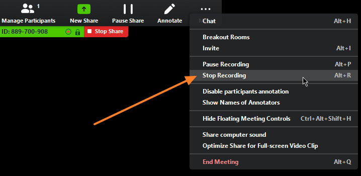 - The recording can be paused or stopped by navigating into the Control Bar, hovering over More, and clicking on Stop Recording.