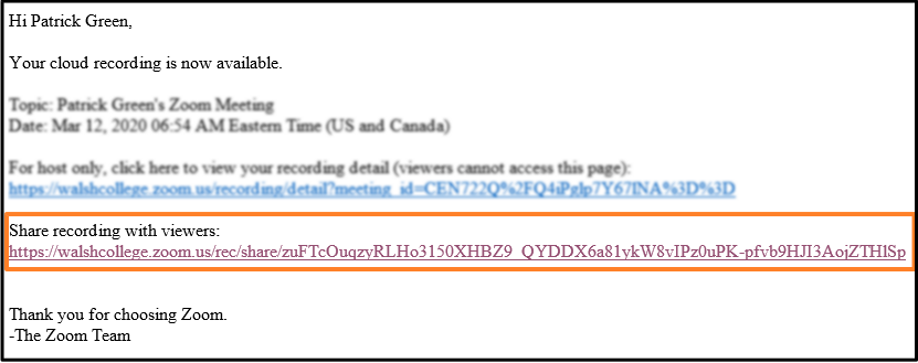 - Locate the email sent to your Inbox with your recording link. be sure to only post or share the second link, labelled "Share recording with viewers"